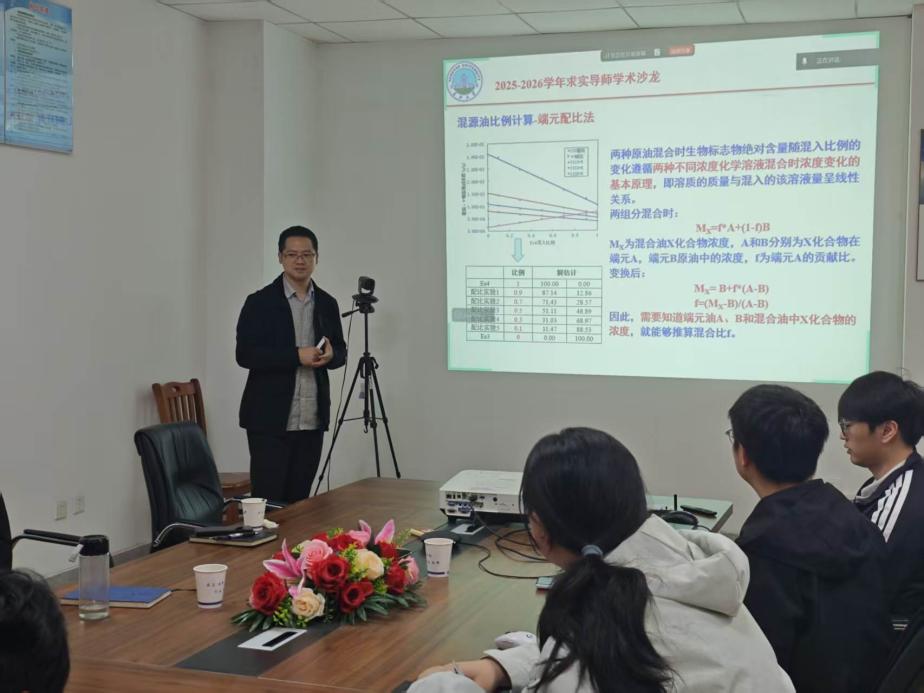 何大祥副教授为同学们带来了《油源定量解析方法及应用》的报告。在石油勘探与开发过程中,准确识别并定量计算经历次生改造的原油混源比例,对于油源对比、资源评估及开发策略制定至关重要。然而,传统直接定量法或端元配比法等方法在处理复杂油源体系时,其适用性和精度常受到地质条件变化、原油成分复杂等因素的限制。针对这一问题,何大祥老师结合实际地质背景与原油特征,在传统方法基础上引入数学分析手段,通过人工配比实验进行方法优化。采用无量纲化与归一化处理技术,有效减弱了不同评价指标间量纲差异对最终结果的影响,从而构建了一套适用于复杂油源体系的混源油定量解析技术。该技术不仅提高了混源比例计算的准确性,还为多源供烃背景下的油源对比与定量判识提供了有力工具。