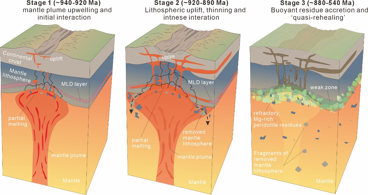 图2. 约9亿年前的徐淮地幔柱事件导致华北克拉通东部岩石圈地幔三阶段演化模式图。阶段1(左):地幔柱上涌与初始相互作用(~940–920 Ma),早期岩浆具洋岛玄武岩的地球化学特征,古老岩石圈地幔贡献不足3%;阶段2(中):岩石圈减薄与强烈相互作用(~920–890 Ma),地幔柱热-机械侵蚀和大陆裂谷作用导致岩石圈显著减薄,晚期岩浆具洋中脊玄武岩特征,岩石圈地幔贡献增至约10%;阶段3(右):浮力残渣增生与“准愈合”(~880–540 Ma),地幔柱活动减弱后,大量难熔、贫熔的橄榄岩残渣增生于减薄岩石圈底部,形成时代与成分复杂的“马赛克”式新根,并继承软弱界面(岩石圈中部不连续面),机械强度逊色于原始克拉通根。