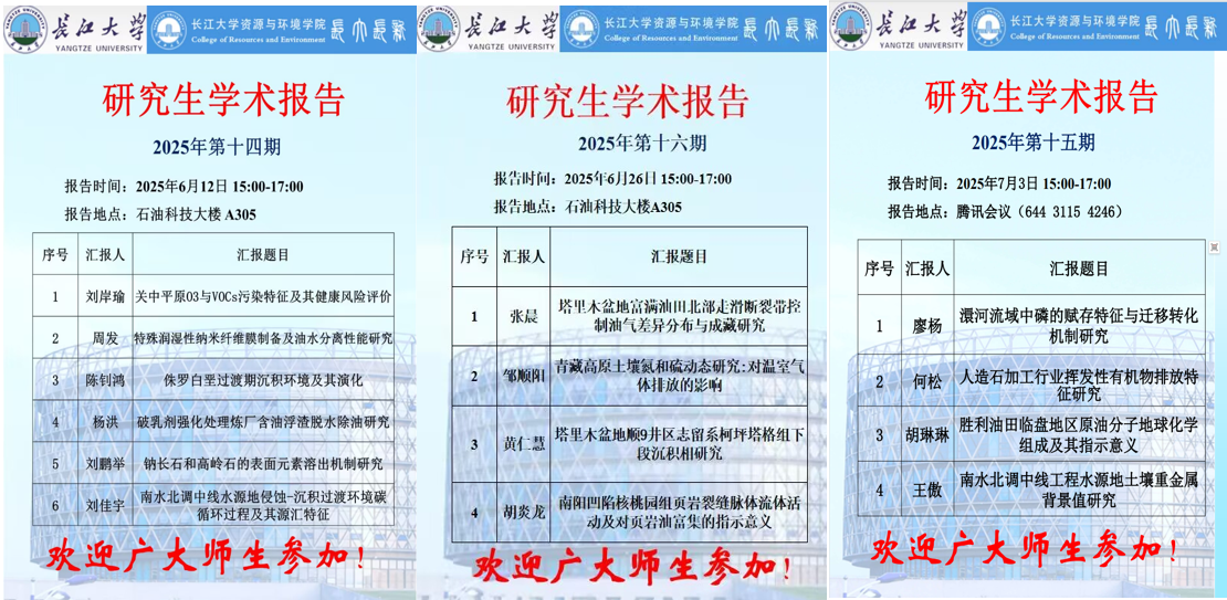 (通讯员 黄鹏)为深入贯彻研究生教育内涵式发展要求,强化学术共同体建设,营造“深耕专业、开放交流”的浓厚研学氛围,长江大学资源与环境学院精心打造的“一院一品”特色品牌活动——“资环大讲堂”研究生学术汇报系列活动已实现常态化、制度化运行。该活动以“每周一讲”的频率,为研究生搭建了一个高水准、常态化的学术交流与能力锤炼平台。