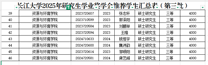 根据省财政厅、省教育厅等部门《湖北省学生资助资金管理办法》(鄂财教发〔2023〕58号)和《长江大学学生资助资金管理办法(修订)》(长大校发〔2025〕112号)以及《长江大学资源与环境学院研究生学业奖学金评审工作实施细则》等有关文件规定,结合学校研究生经费有部分结余,经前期研究生本人申请、导师推荐、学院评审,特将2025年长江大学资源与环境学院研究生学业奖学金增补名单公示如下:
